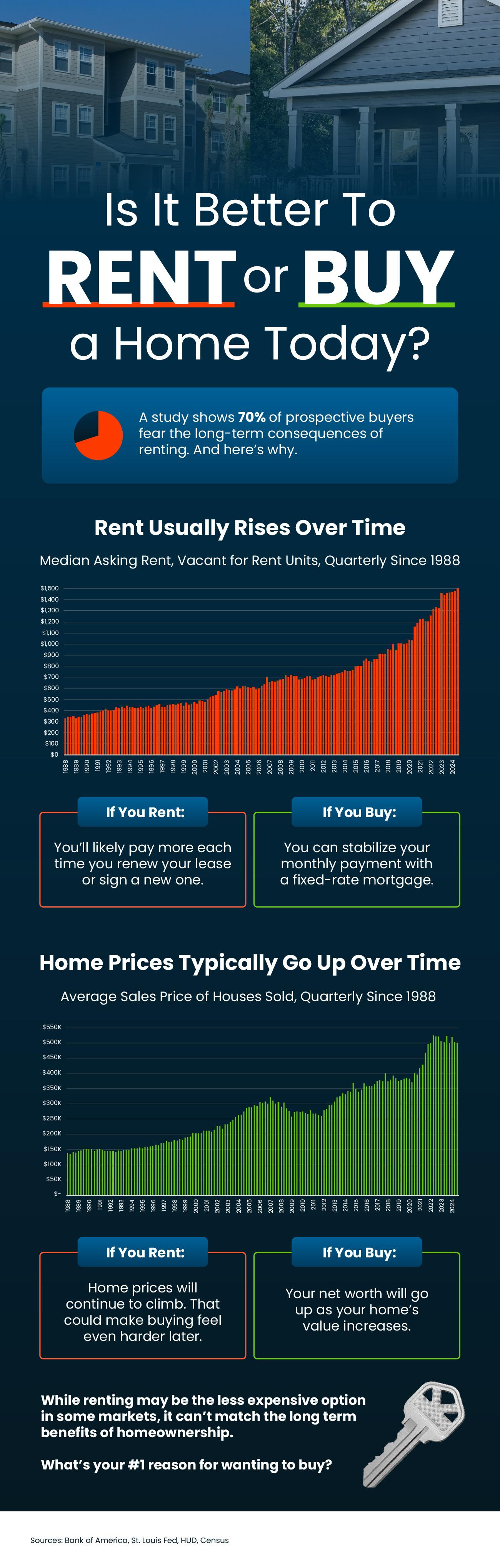 A study shows that 70% of prospective buyers fear the long-term consequences of renting. And here’s why. Rent usually rises over time and that can make it harder to save up to buy a home. But when you buy, you can stabilize your housing expenses and grow your net worth as home values rise. While renting may be the less expensive option in some markets, it can’t match the long-term benefits of homeownership. What’s your #1 reason for wanting to buy?